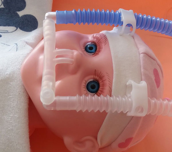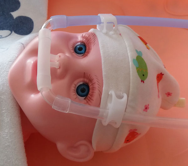上圖:固定斯蒂芬呼吸管路的嬰兒帽